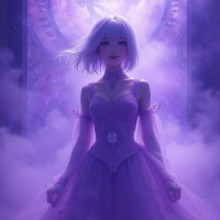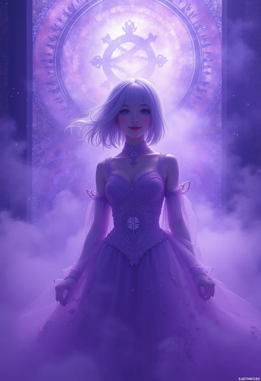 a stained glass window that casts a mystical, purple glow around her, suggesting she is in a magical or enchanted setting. The background is shrouded in purple mist, adding to