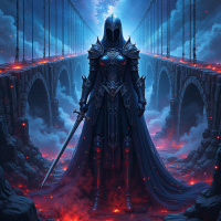 a female warrior in fantasy armor, standing prominently on what appears to be the ruins of a bridge. She is holding a sword upright in her left hand and has