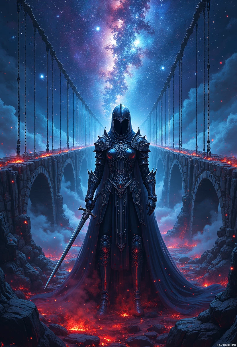 an ethereal scene of a nebula-filled sky transitioning into a fiery landscape below, which includes lava and molten rocks that give the impression of a volcanic or infernal environment. The style of the image is reminiscent of
