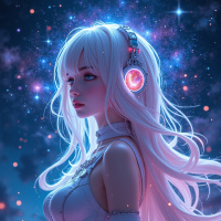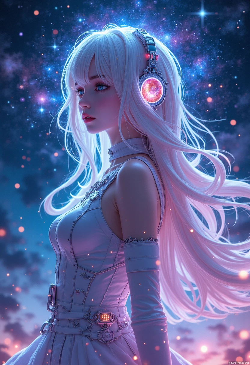 a female character with white hair and a pair of headphones. She is wearing a futuristic or cosmic-themed outfit that includes elements such as