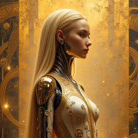 golden armor that includes intricate details and mechanisms. The robot has a sleek and sophisticated appearance, with