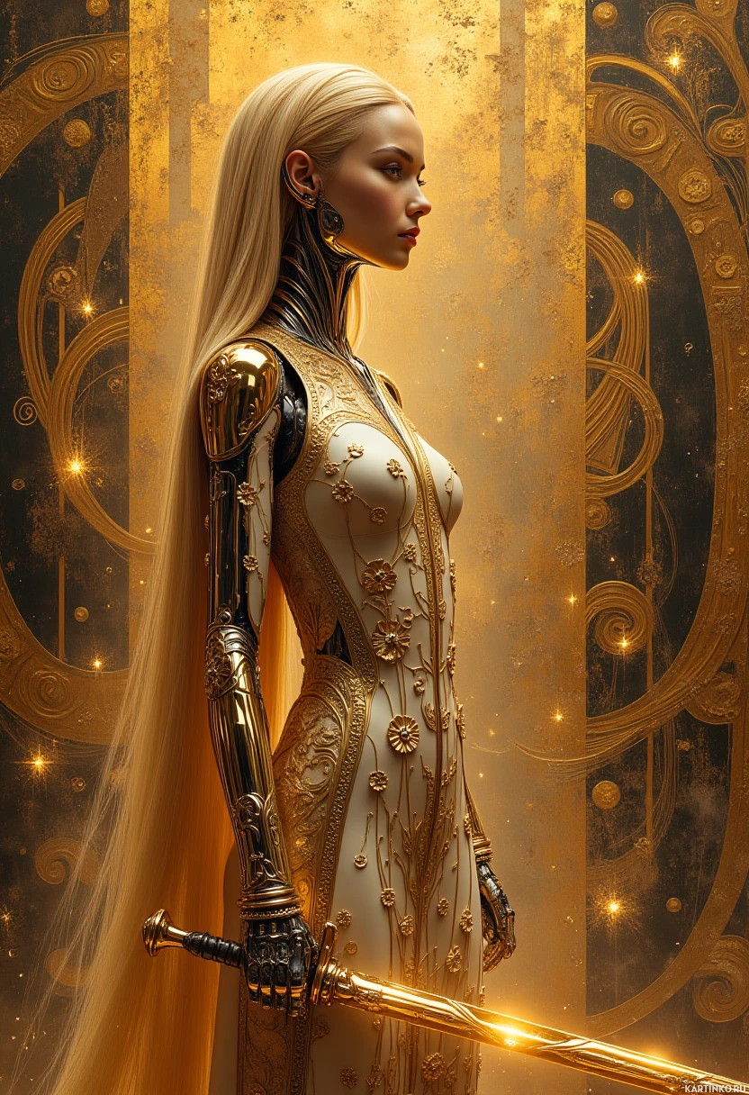 blonde hair and a gold-colored body. It's wearing a complex, ornate