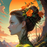 video games and movies. The background shows a landscape that appears to be a blend of natural and fantastical elements. There are mountains in the distance, but also some sort of vines or tendrils emerging from the ground that seem to wrap around the woman's waist and neck. The sky is partly cloudy with warm colors, possibly indicating either dawn or dusk, which adds a serene and magical atmosphere to the scene. There are orange flowers in front of her face, adding a pop of color against the greenery and mountains. These elements together create an ethereal and fantasy-inspired composition that draws on both realistic and imaginative art styles.