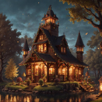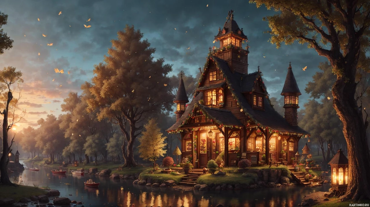 The image depicts a picturesque fairy-tale cottage nestled in an idyllic