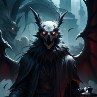 The image portrays a fantasy or horror-themed character, who appears to be an avian demon. This creature is anthropomorphic and stands upright on two legs. It has large,