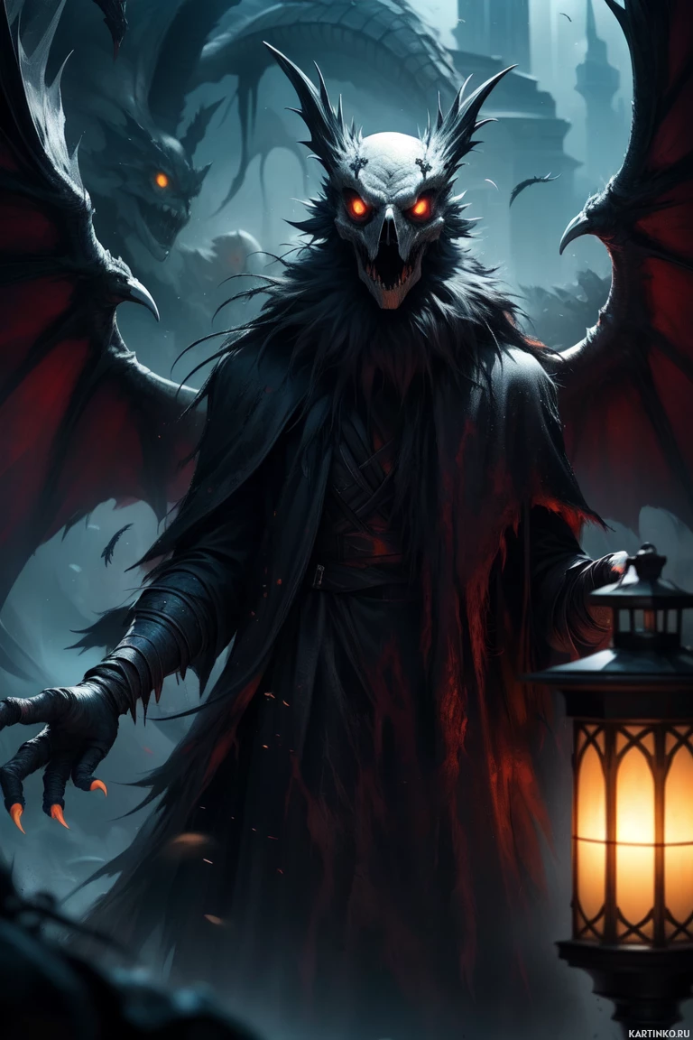 a hooded cloak with what seems to be a skull emblem on it, adding to its ominous presence. The setting is dark and chaotic, possibly
