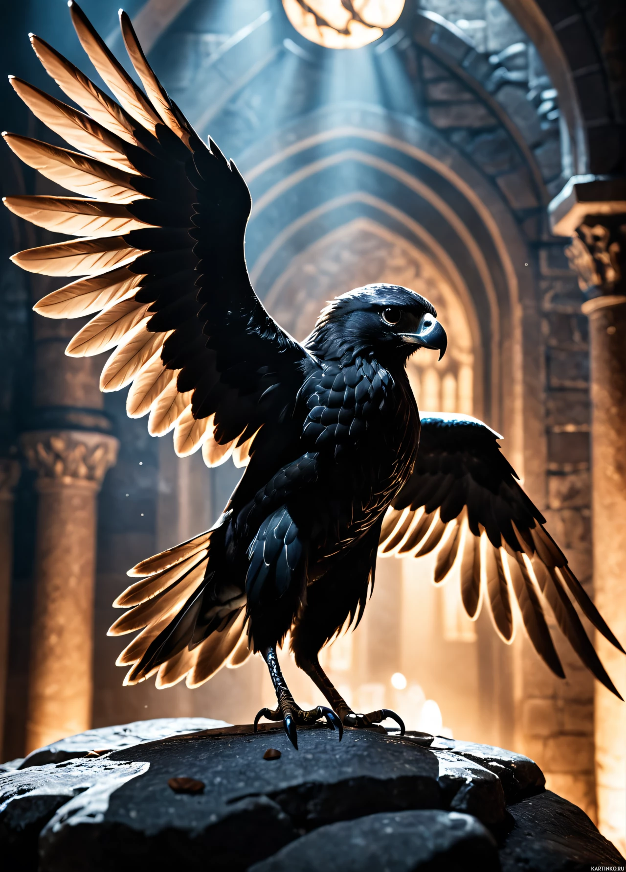 a large bird, likely a hawk or an eagle, perched on what appears to be a rock or ledge. The bird is spreading its wings wide open, which gives the impression of it being in mid-flight or preparing for takeoff. The background features