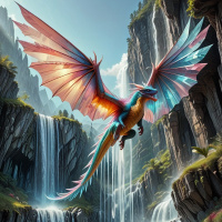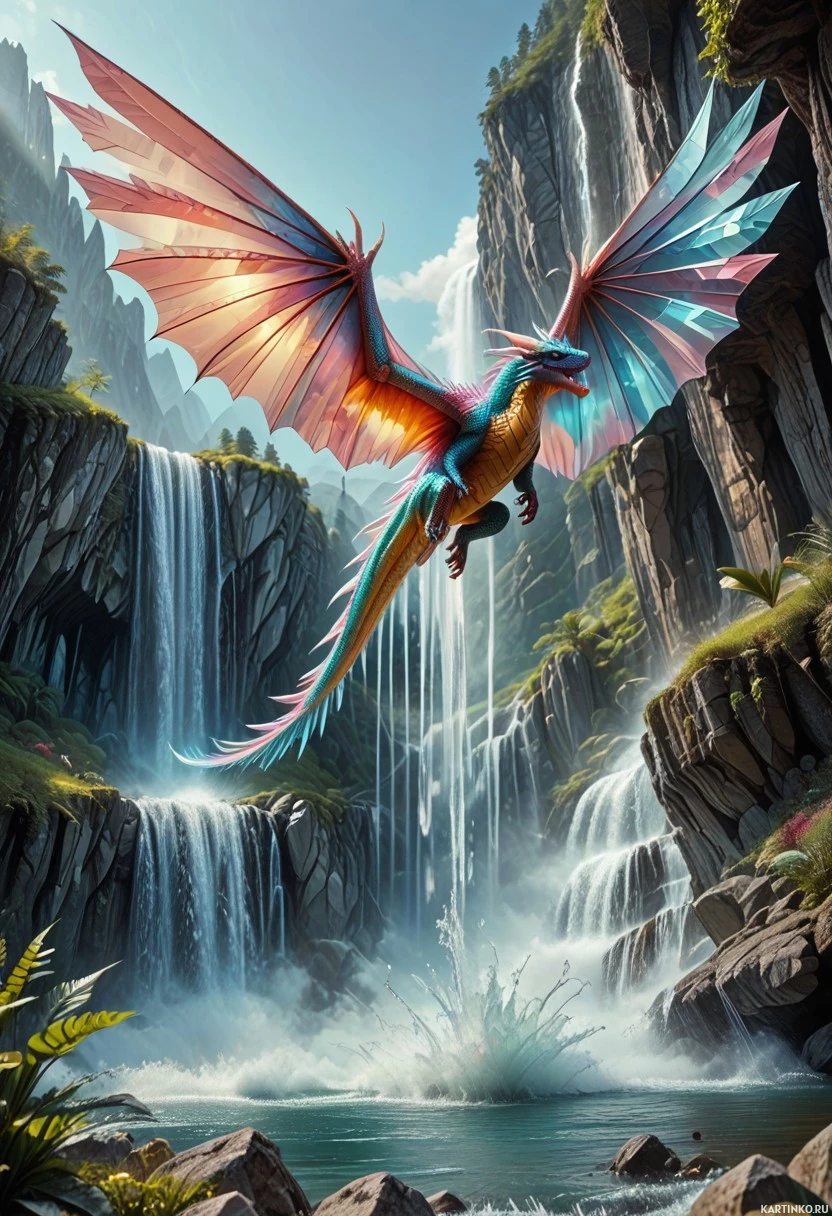 a fantastical scene featuring a dragon. The dragon is centrally positioned, soaring in the air with its wings fully extended, showcasing their