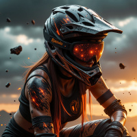 red hair and is wearing a black helmet with a visor that obscures her eyes. Her attire consists of what seems to be a leather or textured garment, likely