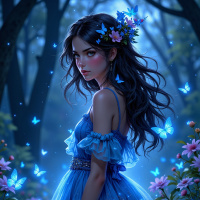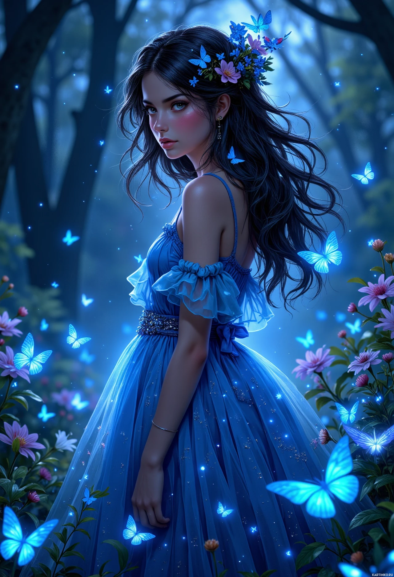 several butterflies fluttering around her, which adds a whimsical and enchanting touch to the scene. The butterflies have iridescent wings that seem to glisten in the light, providing an additional layer of beauty to the image. The overall color palette is soft with pastel tones dominating the scene, creating a dreamy and gentle mood. This style of artwork often emphasizes fantasy or fairytale elements, suggesting themes like magic, nature, or otherworldly experiences.