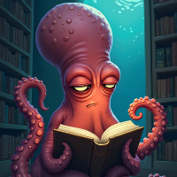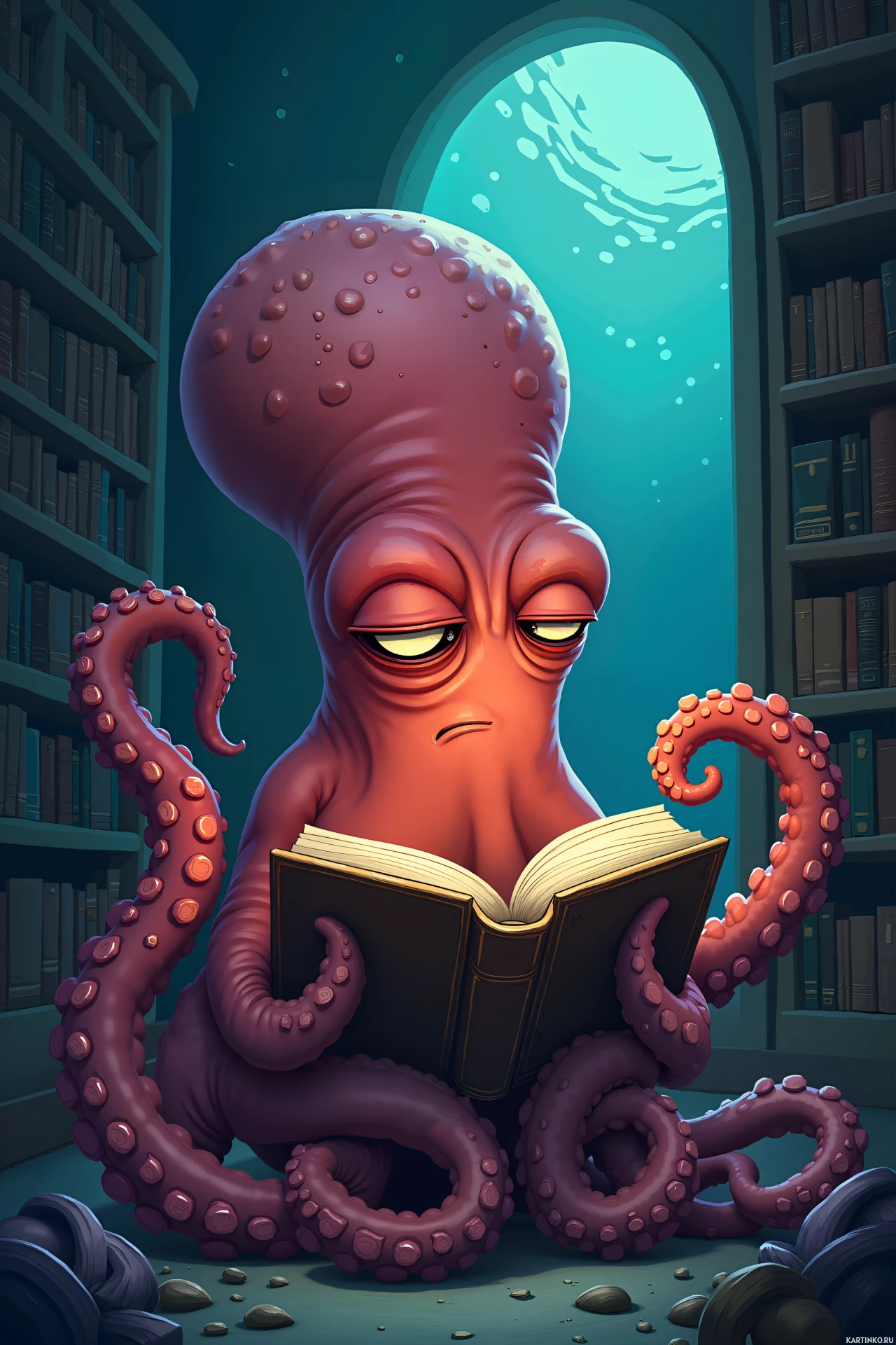 octopus character sitting upright with human-like arms and legs. It is reading a book that lies open in front of it, with the title "The Tide Pool" visible on the spine. The octopus appears to be deep in thought or possibly struggling to understand something, as indicated by its frowning expression and downturned head. In the background, there's a dimly lit bookshelf filled with