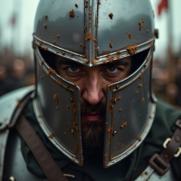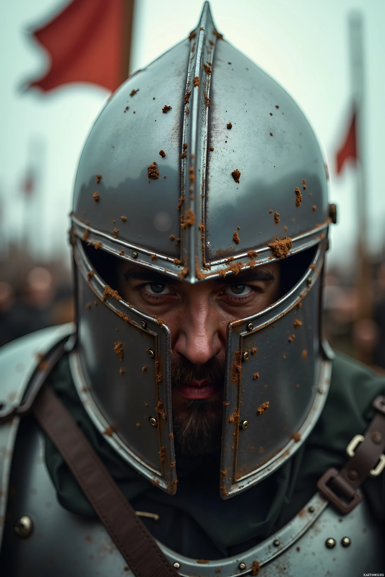 The image depicts a man wearing a historical-style helmet and armor, which are commonly associated with warriors from