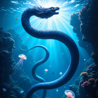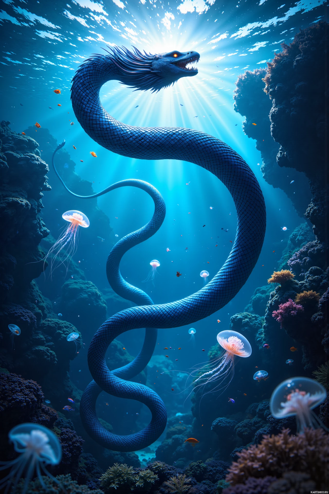 a fantastical scene where a snake is swimming in an underwater environment. The snake appears to have scales resembling that of a fish, and its body coils around