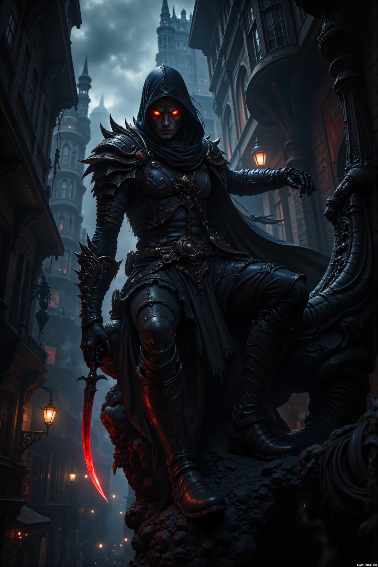 a dark alleyway or street with cobblestones and a gaslamp post, which adds to the atmospheric feel of the image, possibly suggesting that this scene takes place during a time when such lighting methods were commonplace. The overall mood conveyed by the image is one of mystery and intensity, fitting for what might be described as an "evil looking warrior" or "