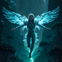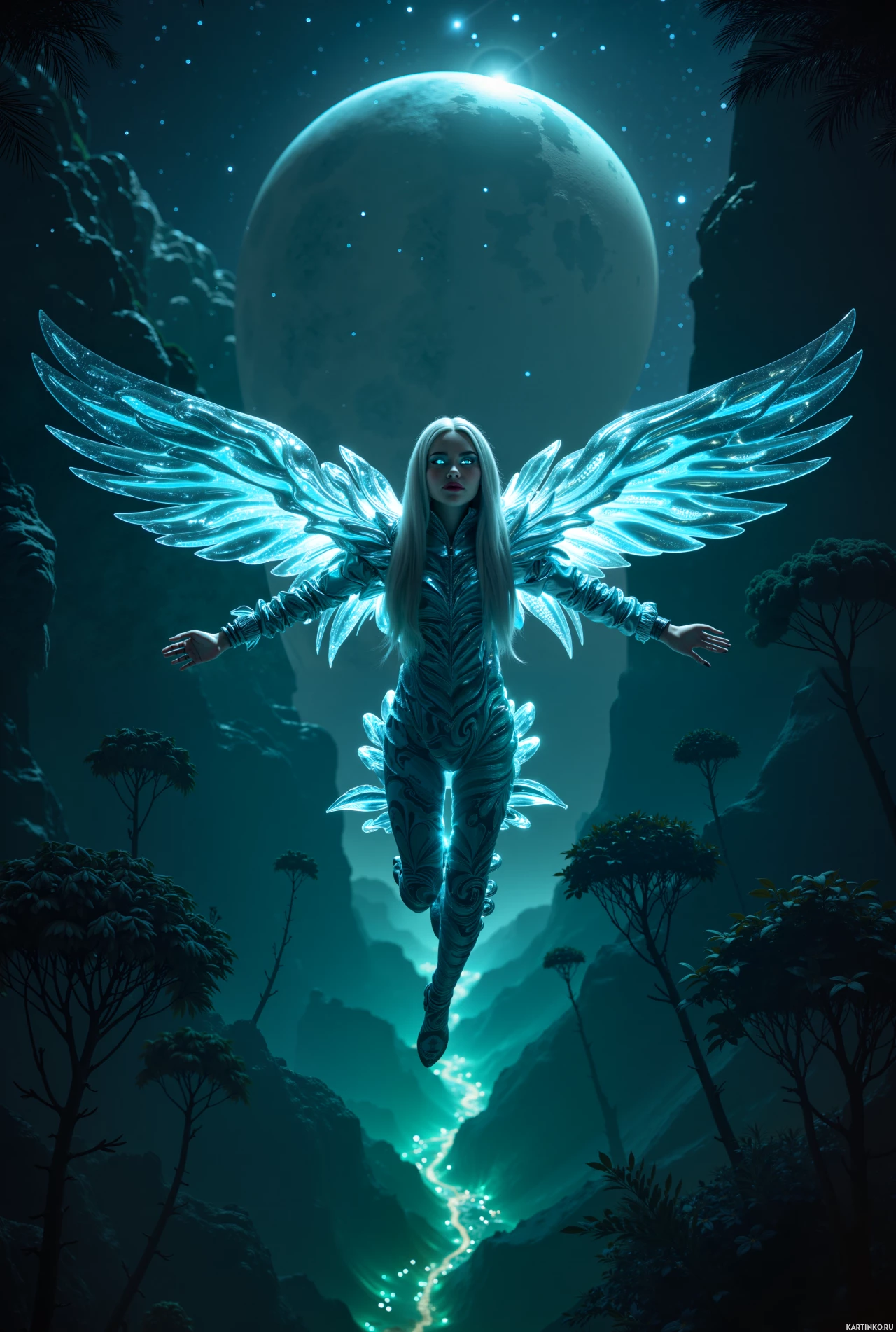 white hair and wings. She is depicted in mid-flight against the backdrop of