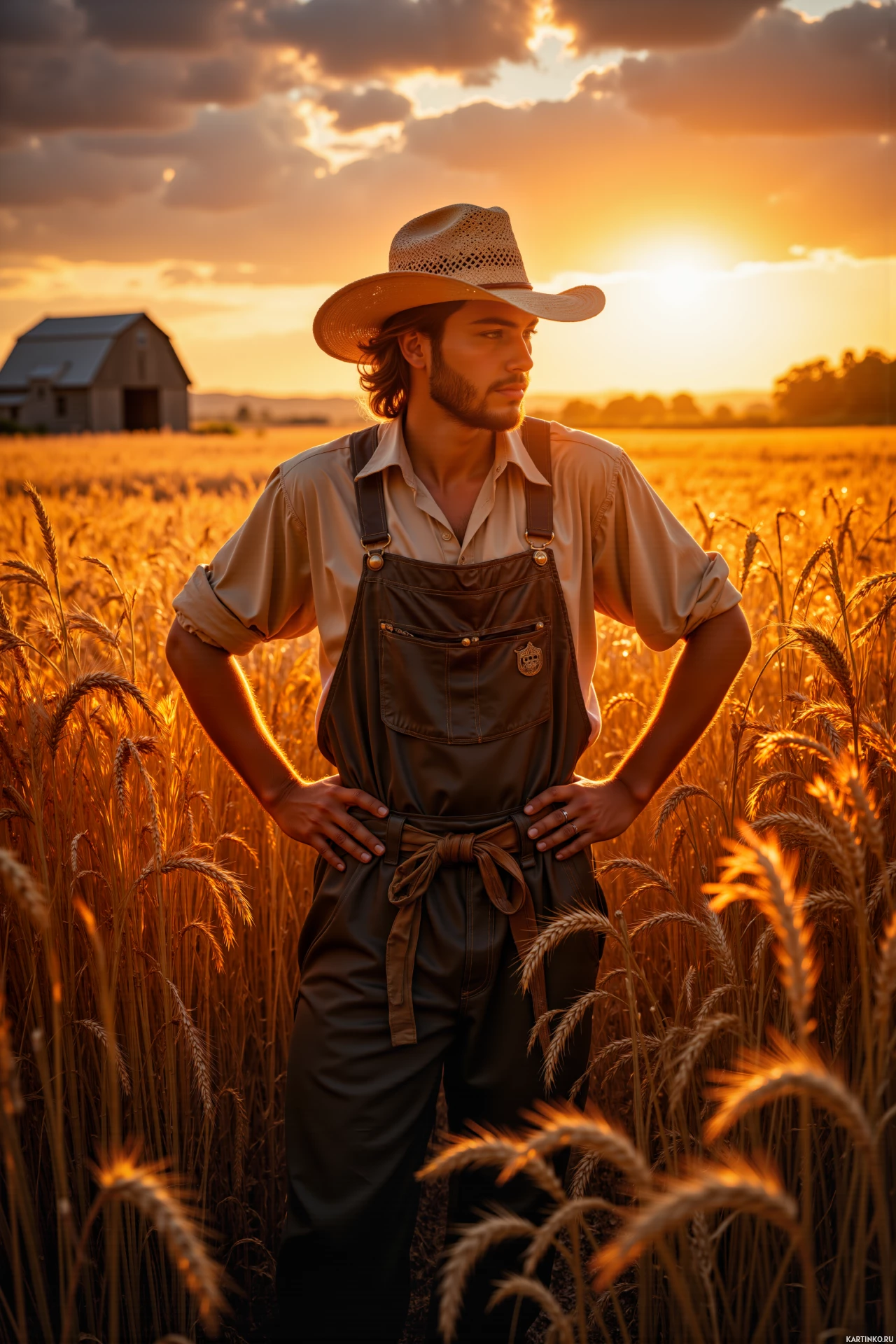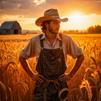 a straw hat and overalls typical of agricultural work attire. The surrounding environment suggests a rural setting with open fields and a silhouette of a farmhouse in the distance under