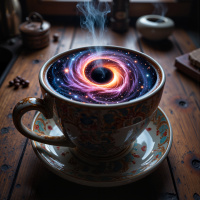a cup of coffee with a design that resembles a black hole. The cup sits on