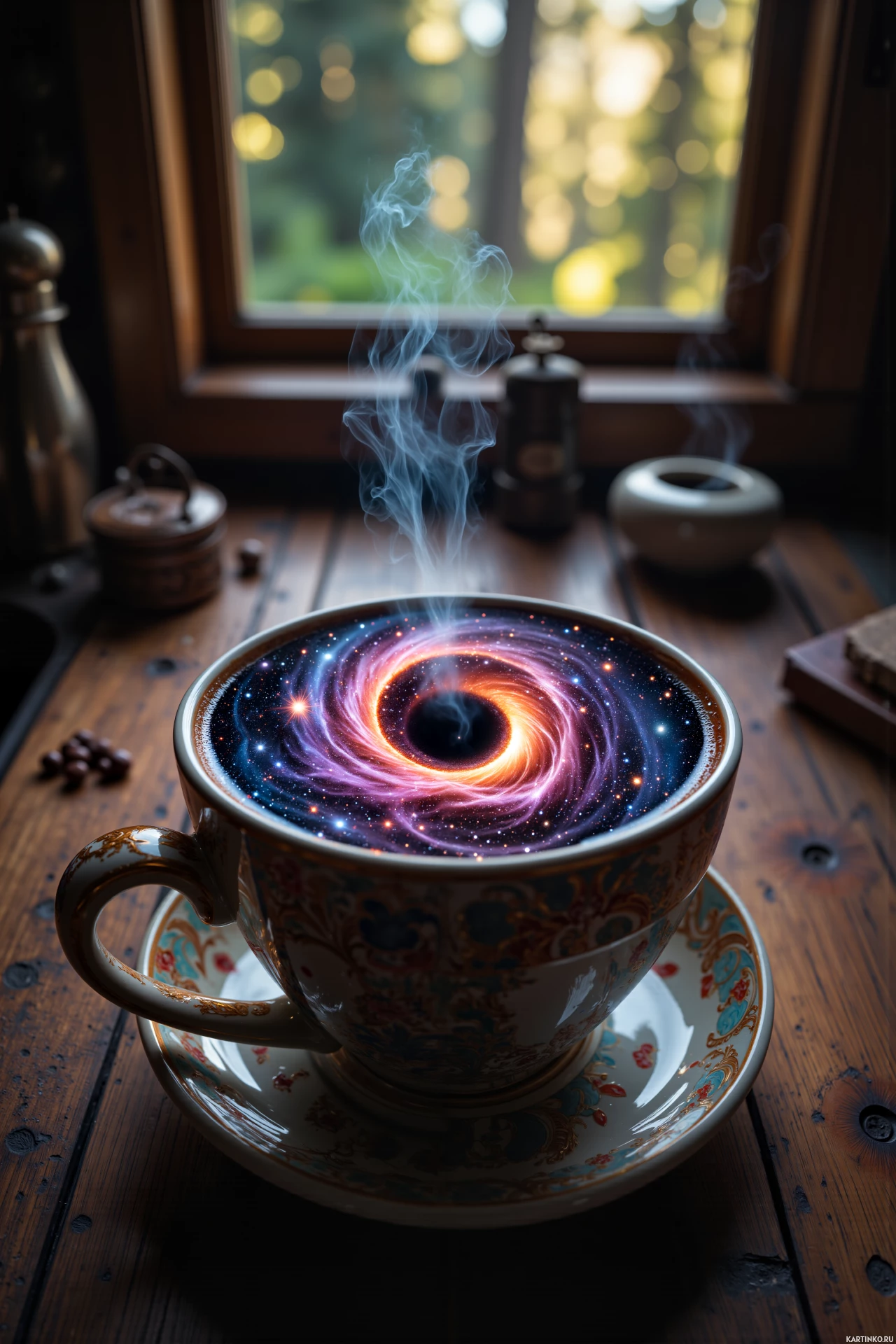 the coffee cup a cosmic appearance, blending elements of space and a black hole's gravity well into its design.