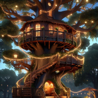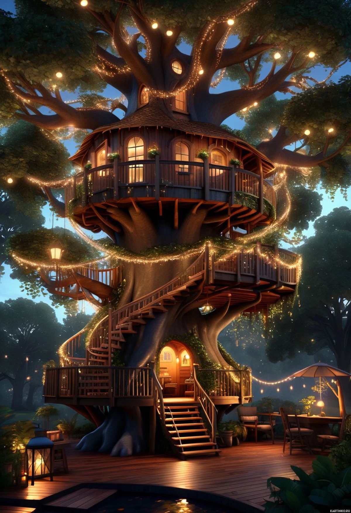 leafy tree with branches extending from its sides. The tree house has a prominent entrance door at ground level, and there are lights illuminating it at night, giving off