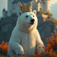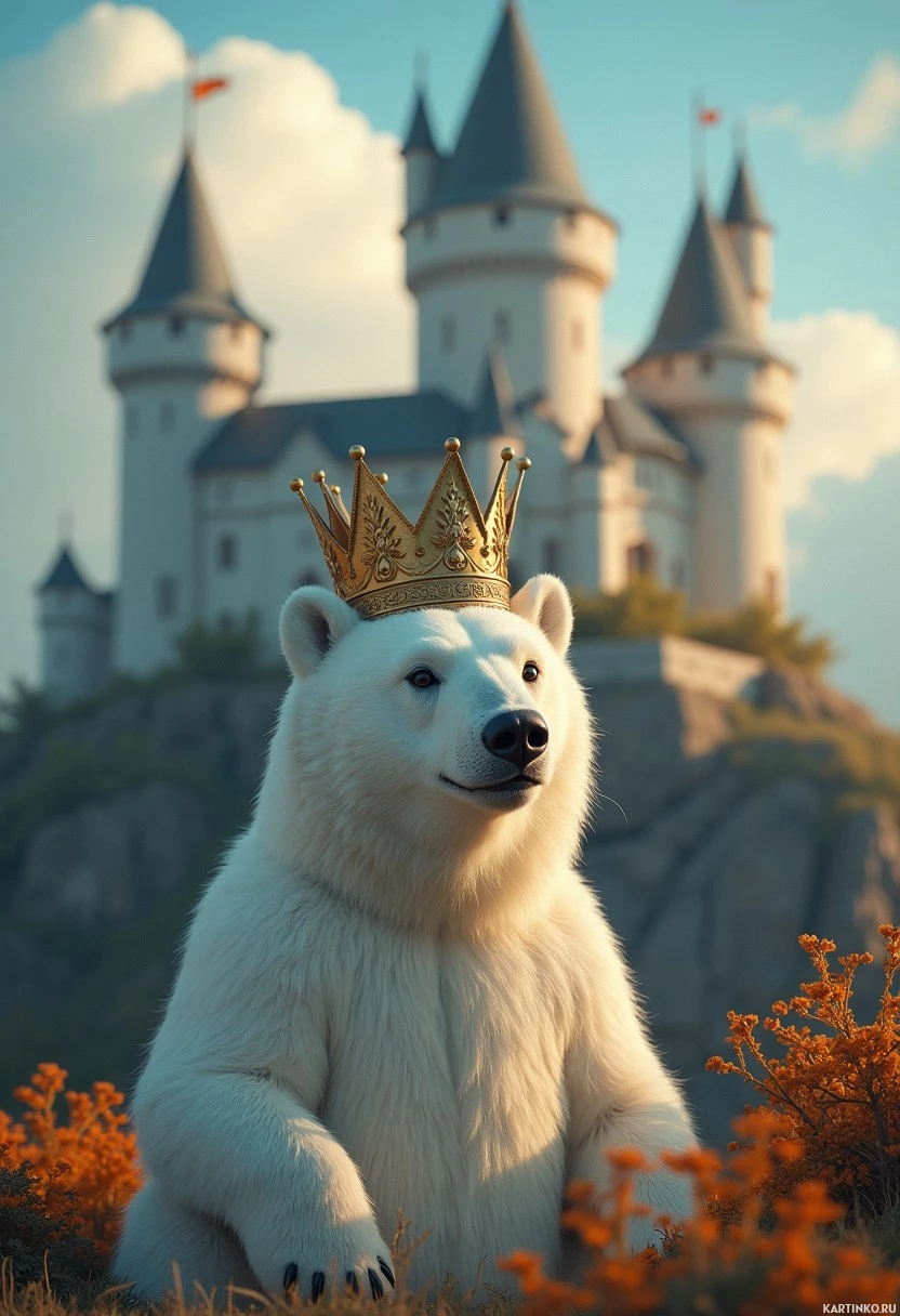 polar bear standing in front of a picturesque castle. The bear is adorned with
