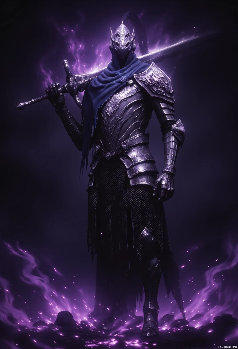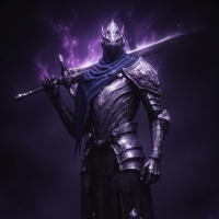 the dramatic effect of the image. The background features swirling purple and black hues, giving the impression of magical energy or a battlefield filled with smoke or fog. The warrior's left hand is raised slightly above their waist, perhaps gesturing in a commanding or defensive manner. The overall mood of the image is intense and powerful, evoking a sense of action and readiness for combat.