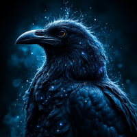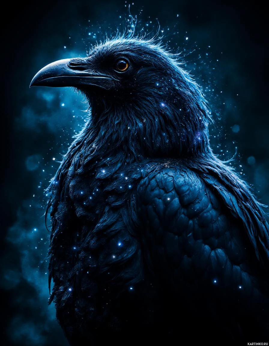 a twilight sky or some sort of ambient lighting effect. The crow's expression seems contemplative or attentive to its surroundings.