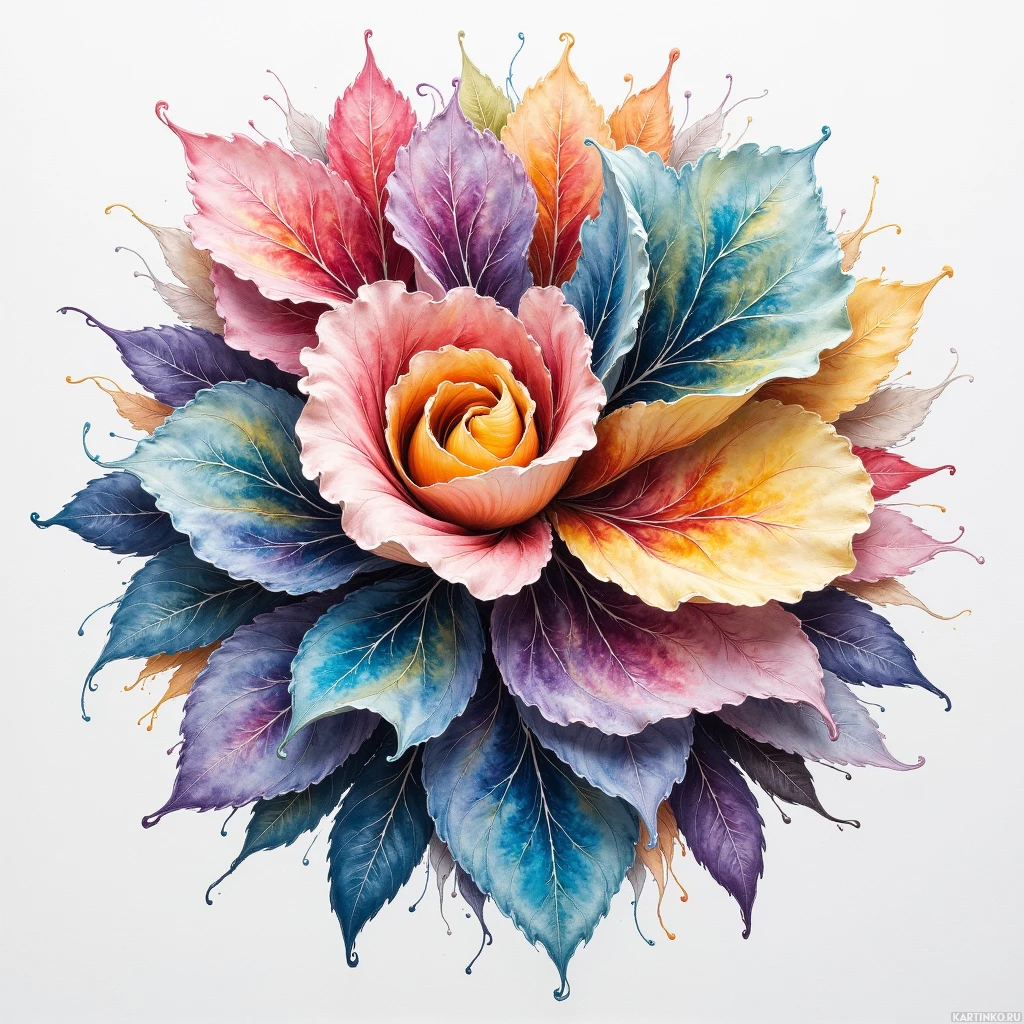 a vibrant pink rose with yellow at its heart, surrounded by a variety of leaves in shades of purple, blue, green, and orange. The background is white, which contrasts with the multi-hued