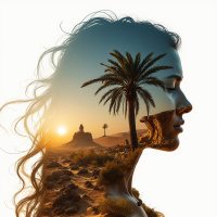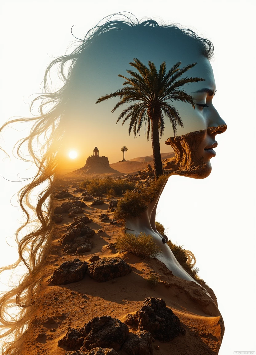 На картинке изображена женщина с закрытыми глазами, словно застывшая в моменте покоя или раздумий. Её силуэт выделяется на фоне пустынного пейзажа под закатным небом. В пустыне виднеется раскидистая пальма и скальные образования. Вдалеке можно различить небольшое строение. Общая атмосфера картинки умиротворяющая, она вызывает ощущение спокойствия и внутренней сосредоточенности.