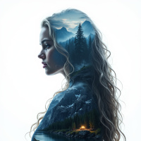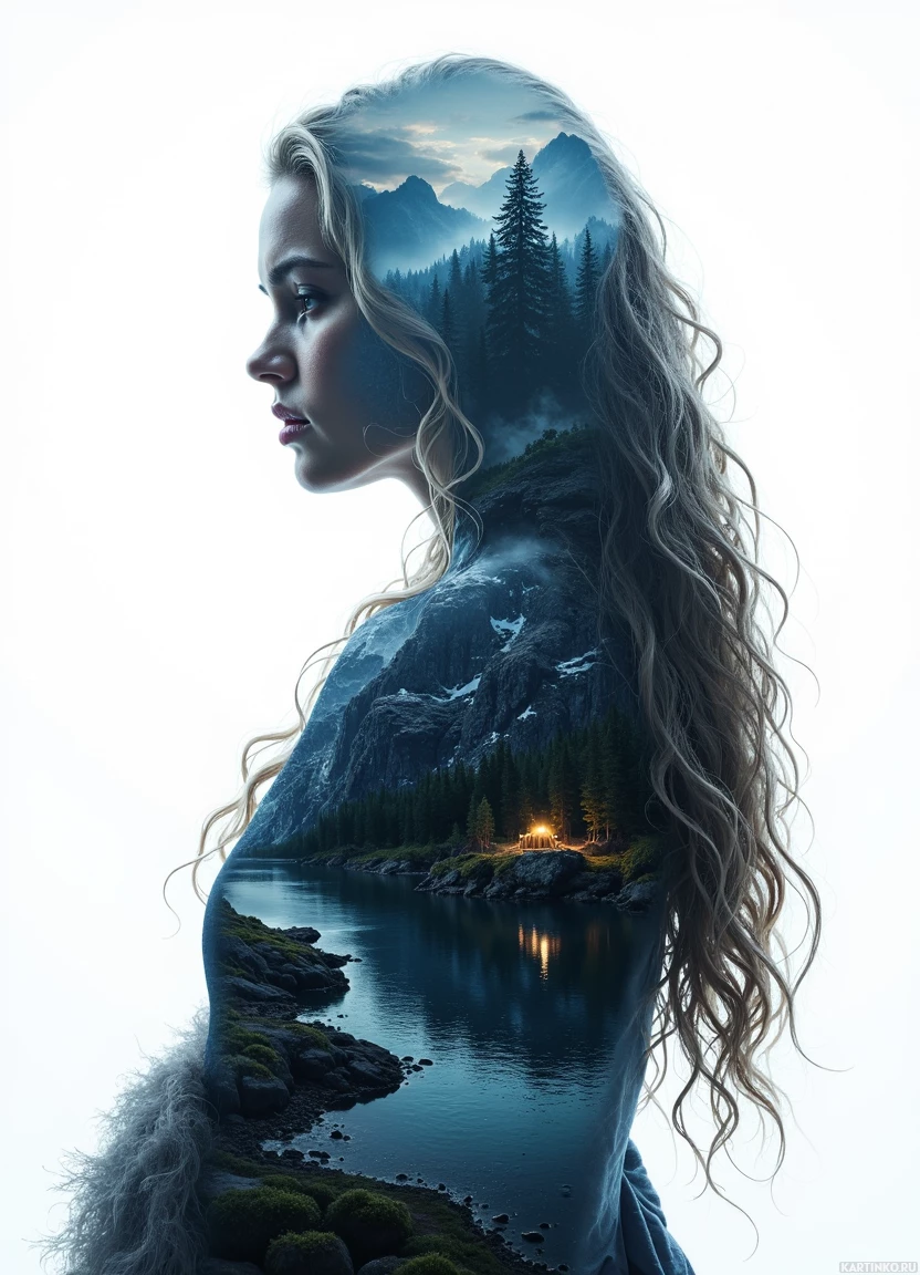 a wilderness landscape. This landscape features a mountain, a forest, a river, and a cabin. The background behind the woman is plain and does not contain any elements.
