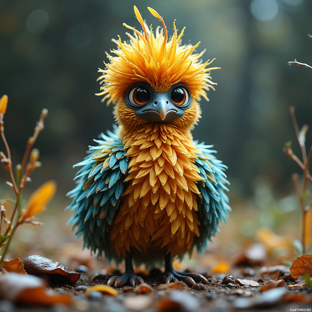 large eyes, and its beak is small and pointed. The background of the image features what appears to be fallen leaves or petals scattered on the ground, suggesting