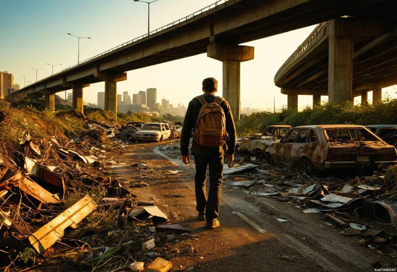 a solitary figure is seen walking away from the camera on what appears to be a run-down urban street. The person is wearing a backpack and seems to be looking down at the ground. They are under a bridge that arches over the street, providing a structural silhouette against the sky. The sun casts