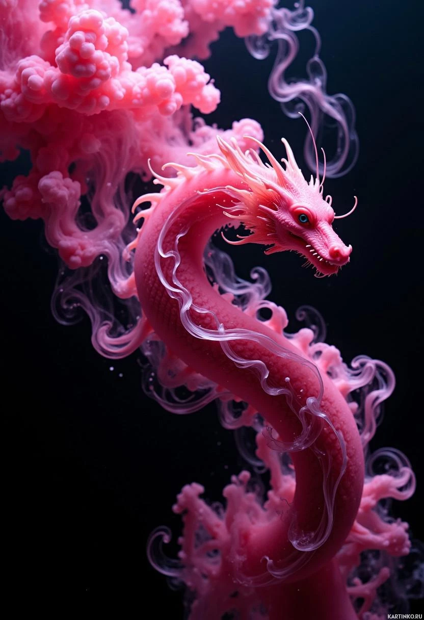 a fantastical dragon in the midst of a cloud-like pink substance. The dragon, with its serpentine body and prominent head features such as horns and eyes, exudes