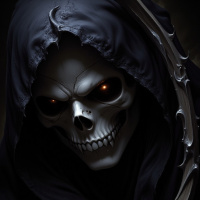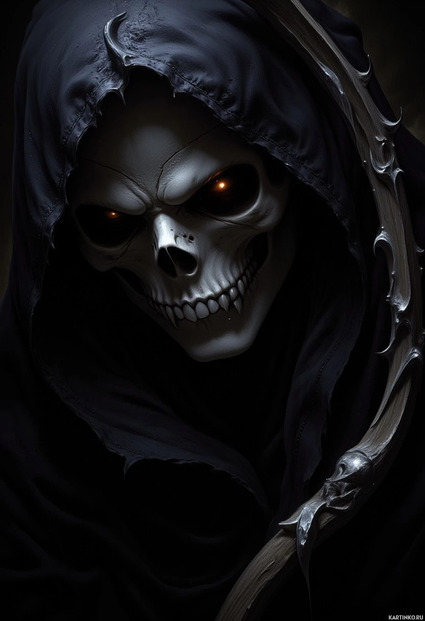 hooded figure draped in shadows is holding the skull, suggesting a narrative element where the figure might be a character from a story related to the theme of death or darkness. The overall style of the image has elements that could be categorized as "horror," given the macabre subject matter and
