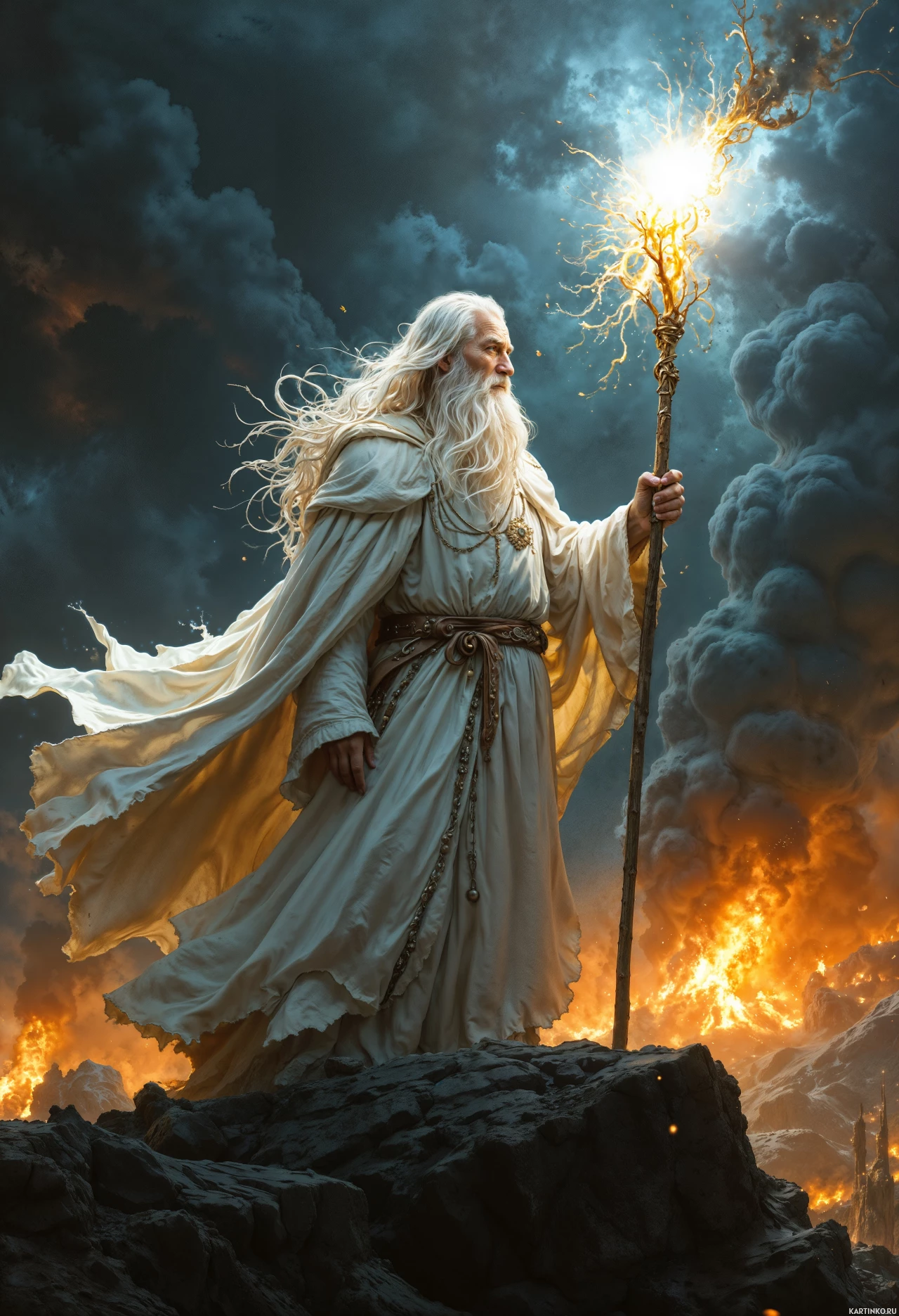 white hair and beard. He is dressed in robes with intricate details that suggest an ancient or magical origin, typical of such characters in