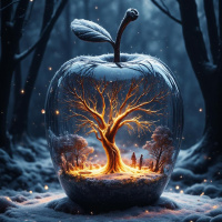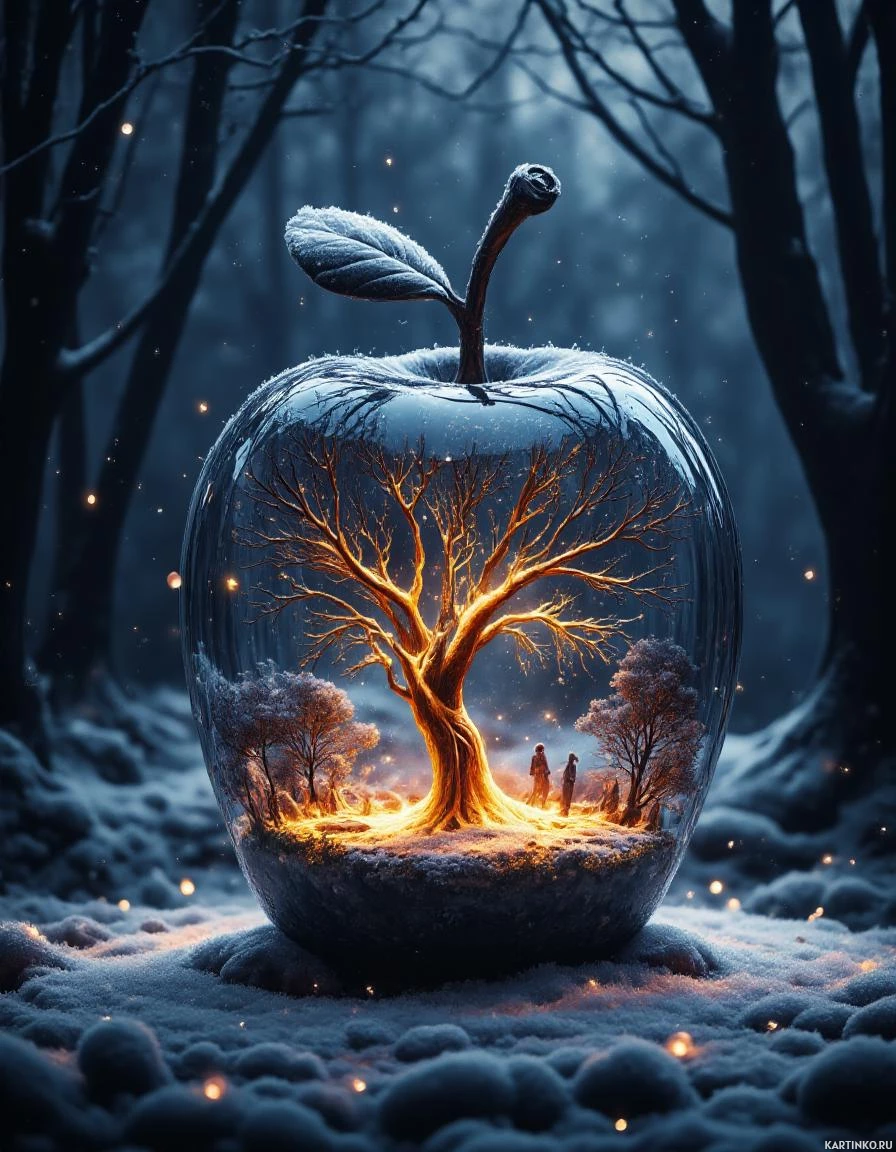 На картинке изображено яблоко, внутри которого спряталось миниатюрное дерево. У этого дерева множество ветвей с листьями и зеленью, создавая впечатление крошечного леса или сада. У подножия дерева можно увидеть маленькие фигурки, похожие на людей или животных, занятых разными делами, например, лазанием или просто стоящих рядом. Фон представляет собой зимнюю ночную сцену со снегом и деревьями, освещенную светящимися шарами, парящими в воздухе, что создает волшебную и сказочную атмосферу. Цветовая гамма приглушенная, с темными оттенками, вызывающими чувство спокойствия и таинственности.
