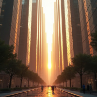 The image depicts an urban scene at sunrise or sunset. The skyline features a series of tall, modern skyscrapers with many windows, giving the impression of a dense city environment. Sunlight is seen streaming through the buildings and reflecting off the wet pavement of a road that cuts through the middle of the image. A few individuals can be seen walking along the sidewalk on the right, and there are trees interspersed among the concrete structures, suggesting some effort at urban greenery or landscaping. The overall atmosphere is serene yet bustling with the promise of day or night depending on the direction of sunlight.