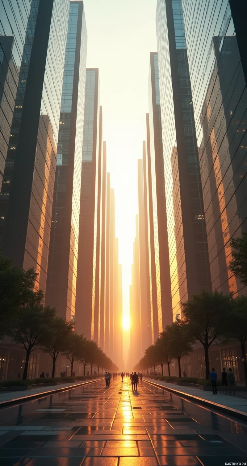 На картинке – городской пейзаж на рассвете или закате. На фоне возвышаются стройные современные небоскрёбы с множеством окон, создающие ощущение плотной городской застройки. Солнечный свет пробивается сквозь здания и отражается от мокрого асфальта дороги, проходящей через центр кадра. Справа по тротуару идут люди, а среди бетонных конструкций виднеются деревья, намекающие на попытку добавить зелени в городской ландшафт. Атмосфера спокойная, но в то же время полная ожидания начала или окончания дня, в зависимости от направления света.