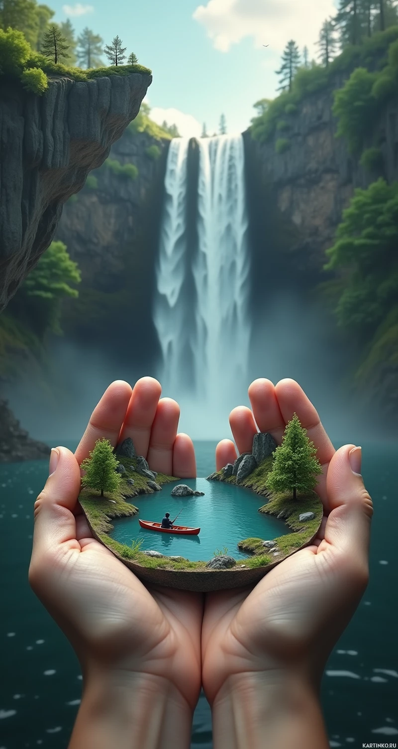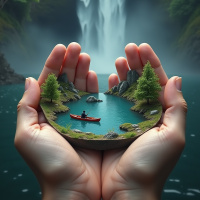 a body of water in the background. It's an artistic and visually striking composition with a landscape that resembles a miniature diorama, possibly held within