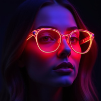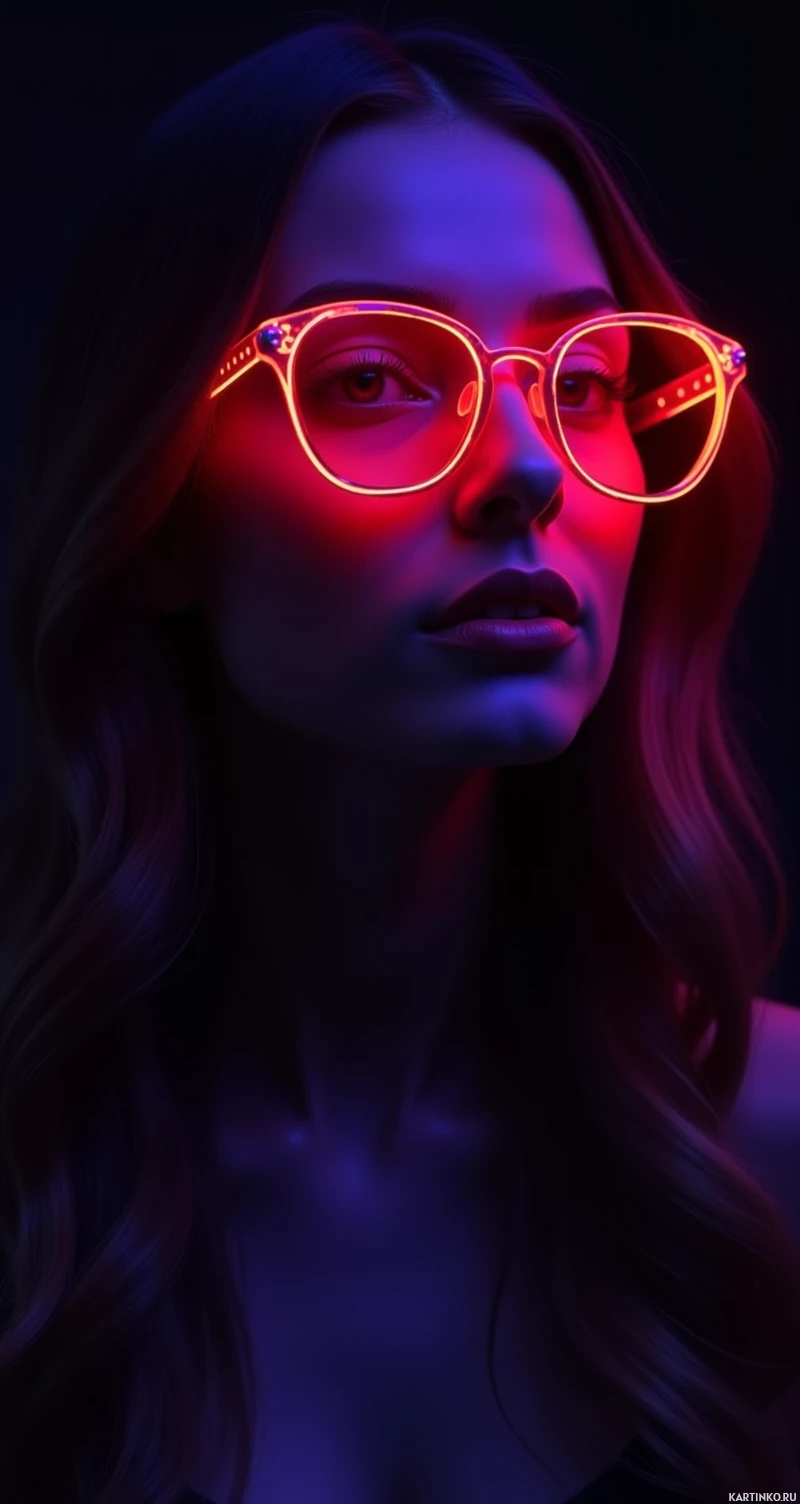 the artificial lighting that highlights her face and glasses. The background is dark, which contrasts with
