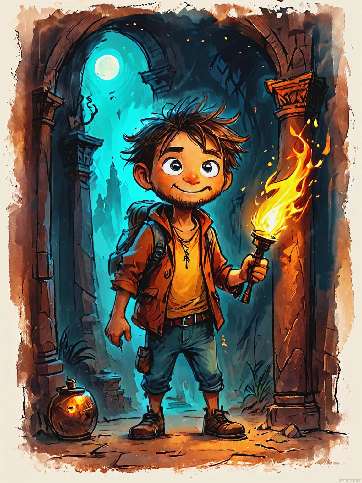 a white shirt and has a backpack on his shoulders. In his right hand, he holds a torch that is lit at the top. The background shows an outdoor scene at night, with