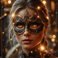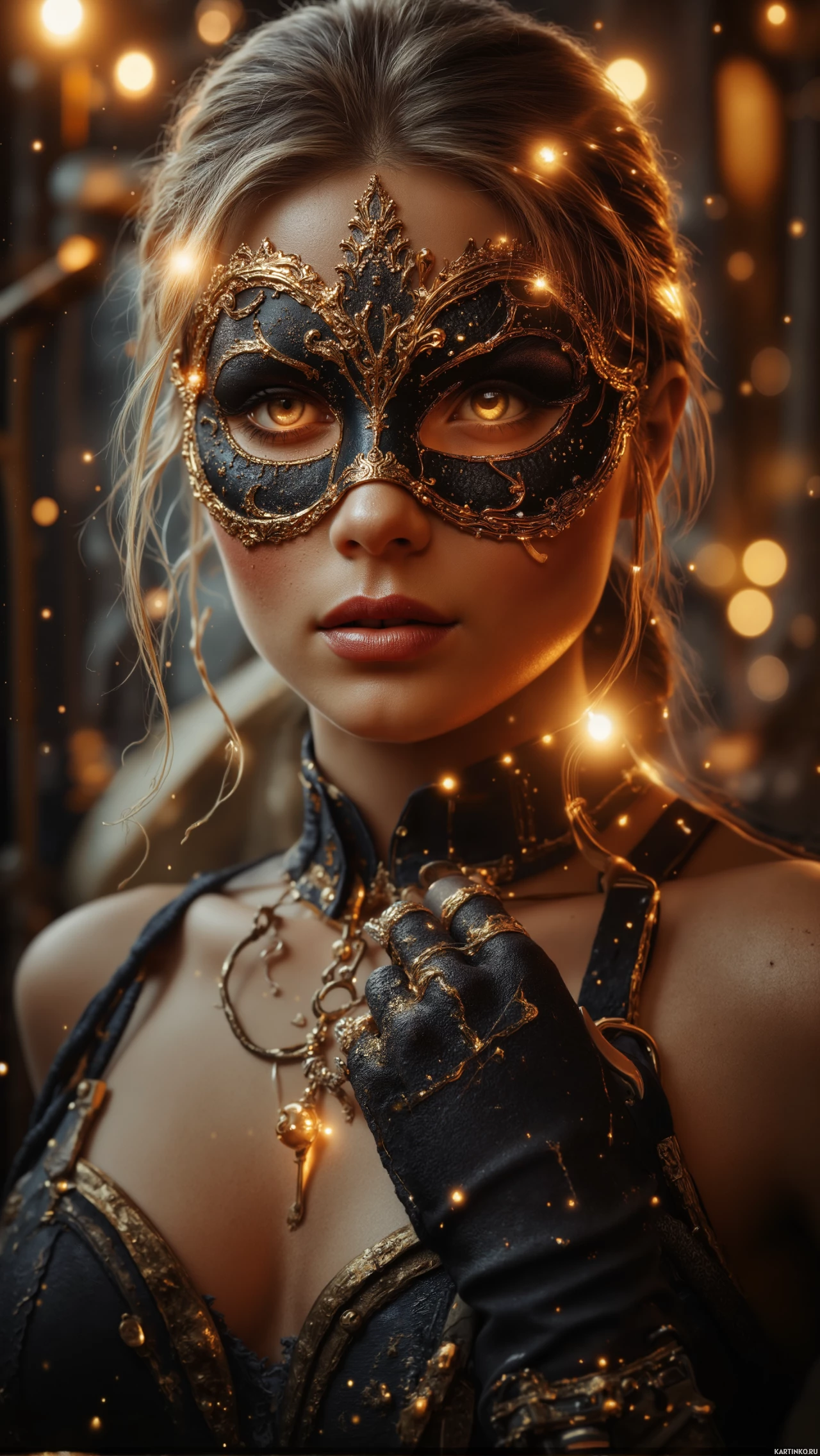 The image features a person wearing a mask and what appears to be a costume that suggests a historical or theatrical setting, possibly inspired by Venetian