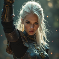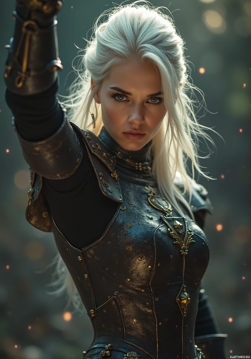 dark armor that suggests a medieval or fantasy setting. Her gaze is intense and directed towards the viewer, conveying