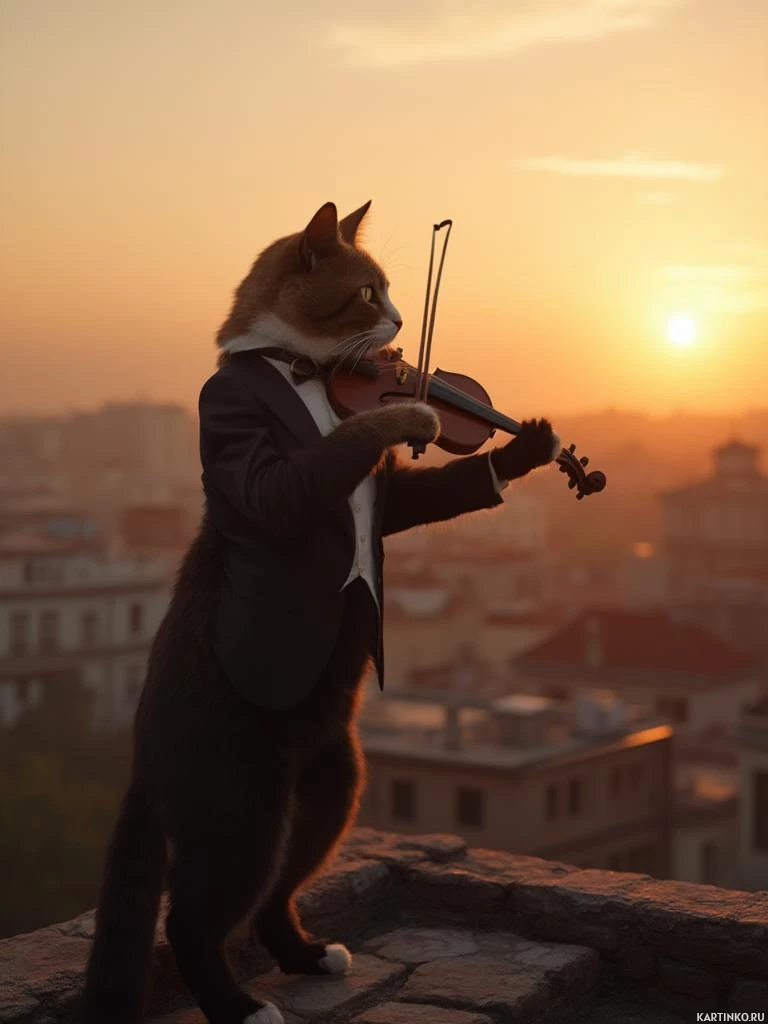a bow tie, and it holds a violin in its paws. Behind the cat, you can see an urban landscape with buildings under