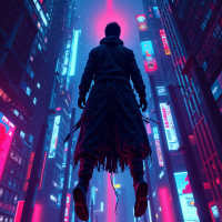 a city skyline that resembles Tokyo's famous district, Shinjuku. The buildings have bright neon signs, and there are large screens displaying what appears to be advertisements or information in