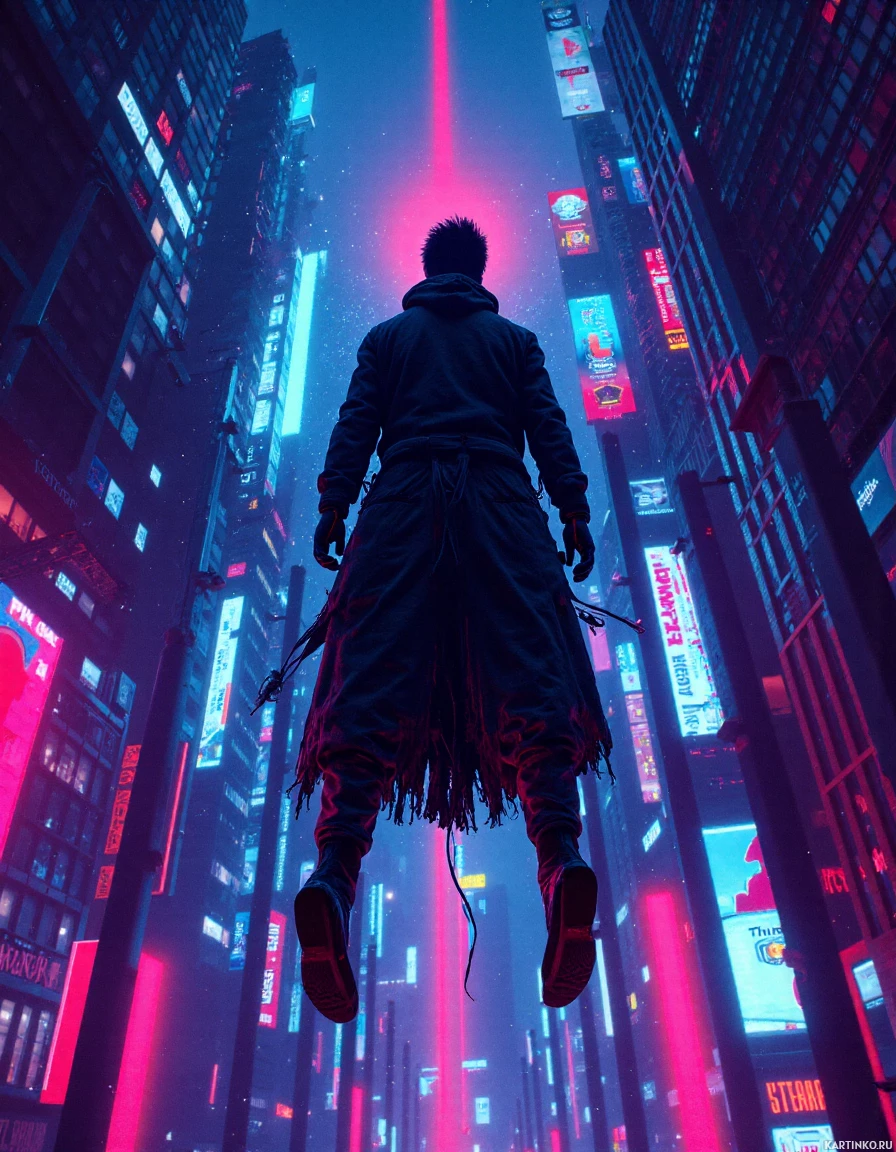 long hair. His arms are outstretched, suggesting movement. The backdrop of the scene is