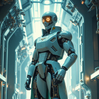 a futuristic setting, possibly an underground or industrial area. The robot has a sleek, chrome-like finish with articulated joints and is adorned with