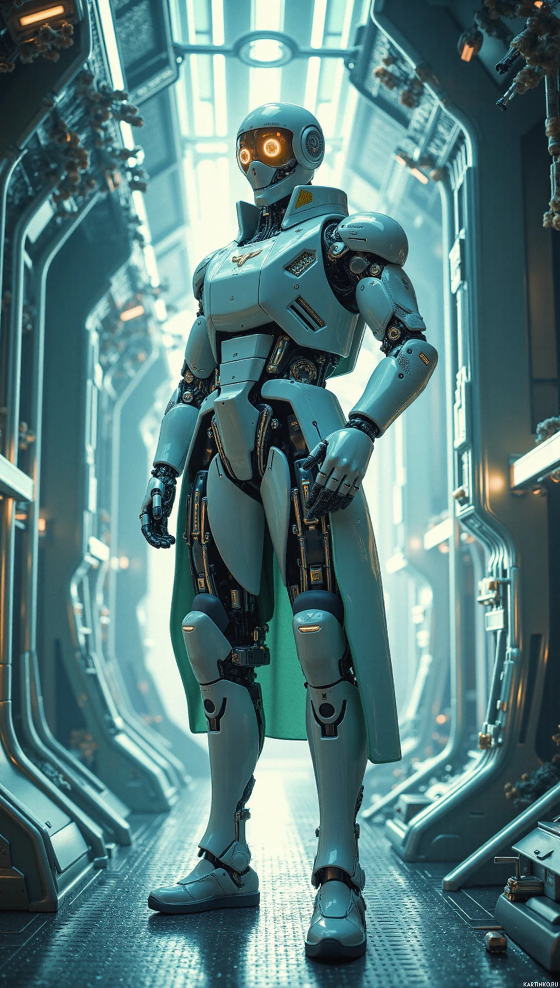 a green cloak that drapes over its lower body and shoulders. It has a head with a display screen instead of human features, suggesting