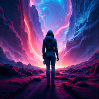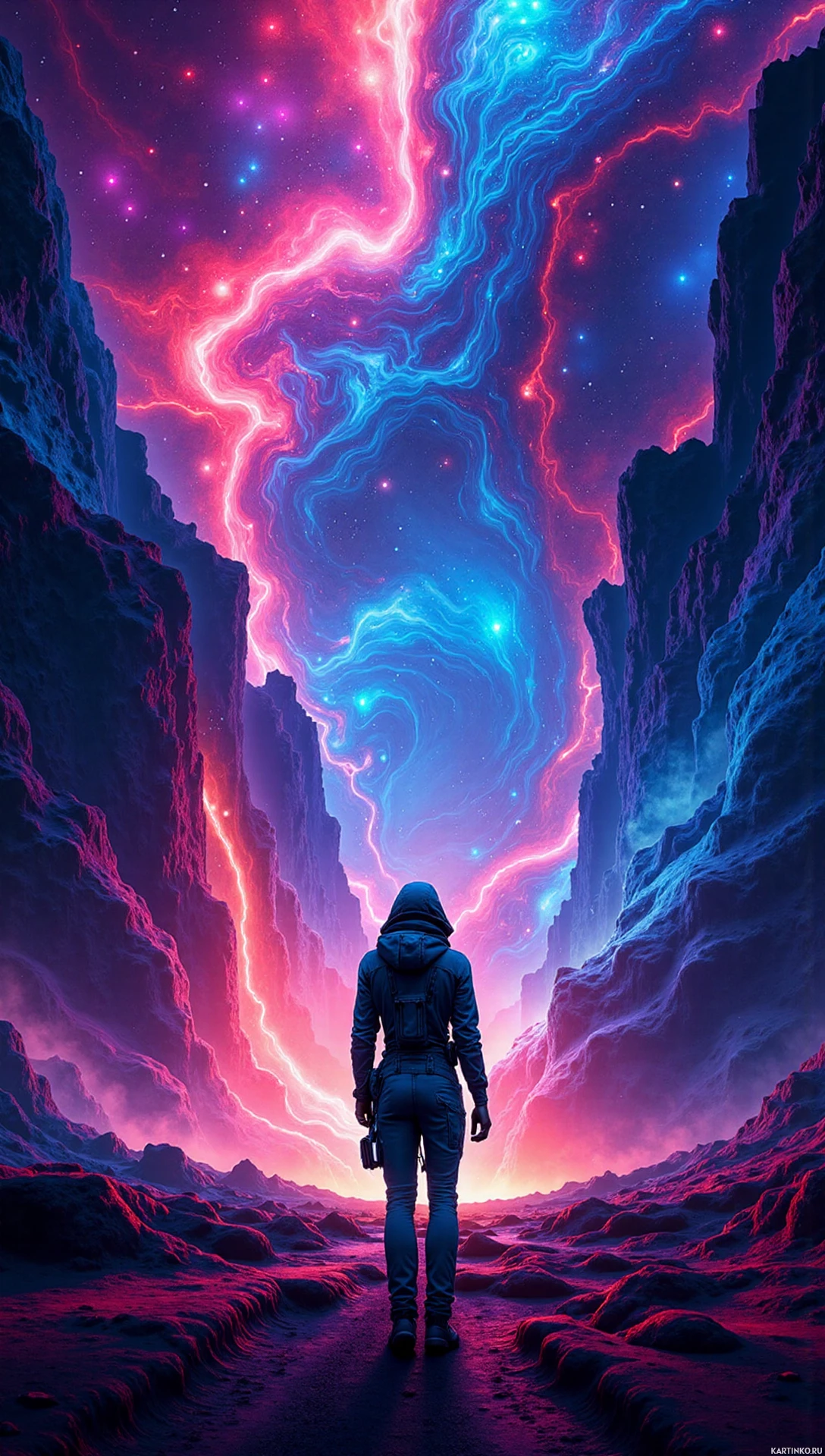 vibrant colors resembling nebulae extends into the distance. On this path, there is a figure who appears to be observing or contemplating the view. The person is wearing a backpack and is facing away from the viewer, towards