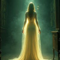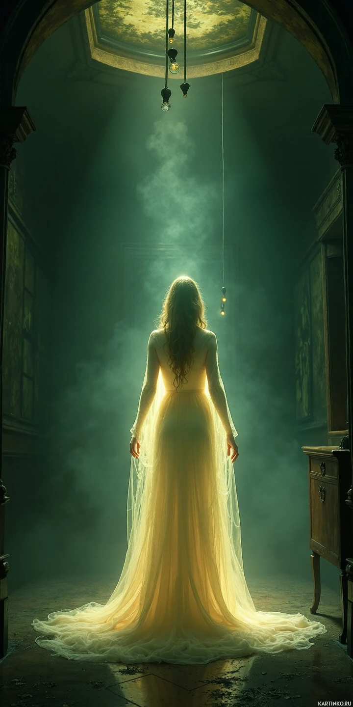 long hair. She is wearing a dress that reaches her feet, which could suggest a formal or ceremonial occasion. The setting has an antique or historical feel, with visible stonework on walls and what looks like a chandelier hanging from the ceiling. There's