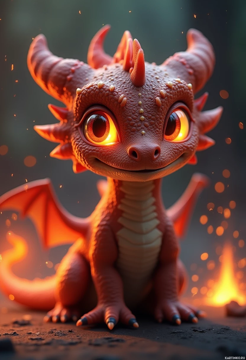 a friendly expression, with a slight smile and its wings slightly extended as if it is in motion or about to take flight. The dragon's skin appears to have
